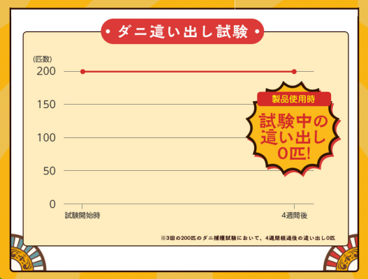 *3回の200匹のダニ捕獲試験において、4週間経過後の這い出し0匹