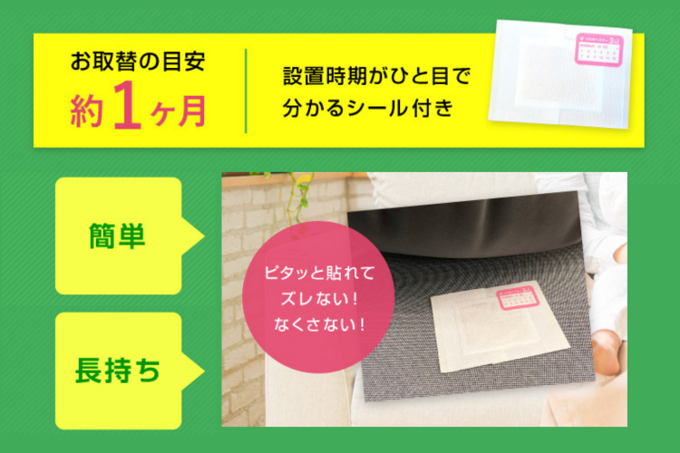 簡単に設置できる貼るタイプのシートで、貼るだけで約1ヶ月ダニを集め続けてくれます。